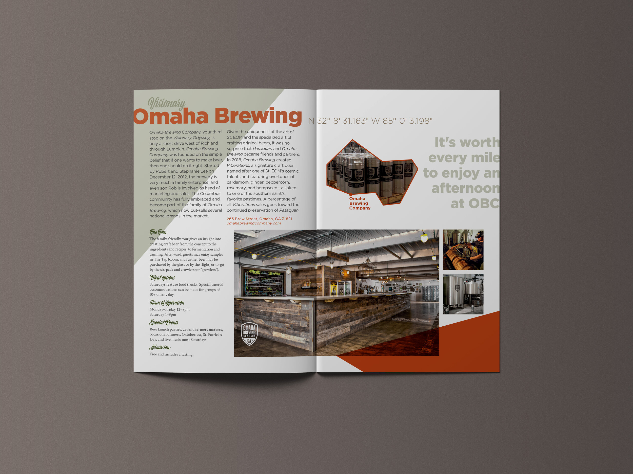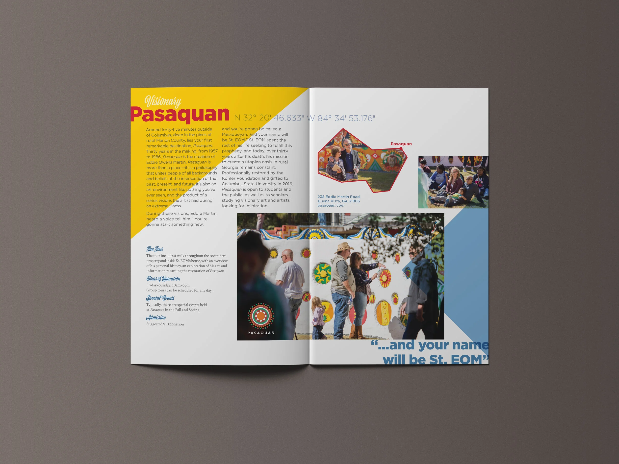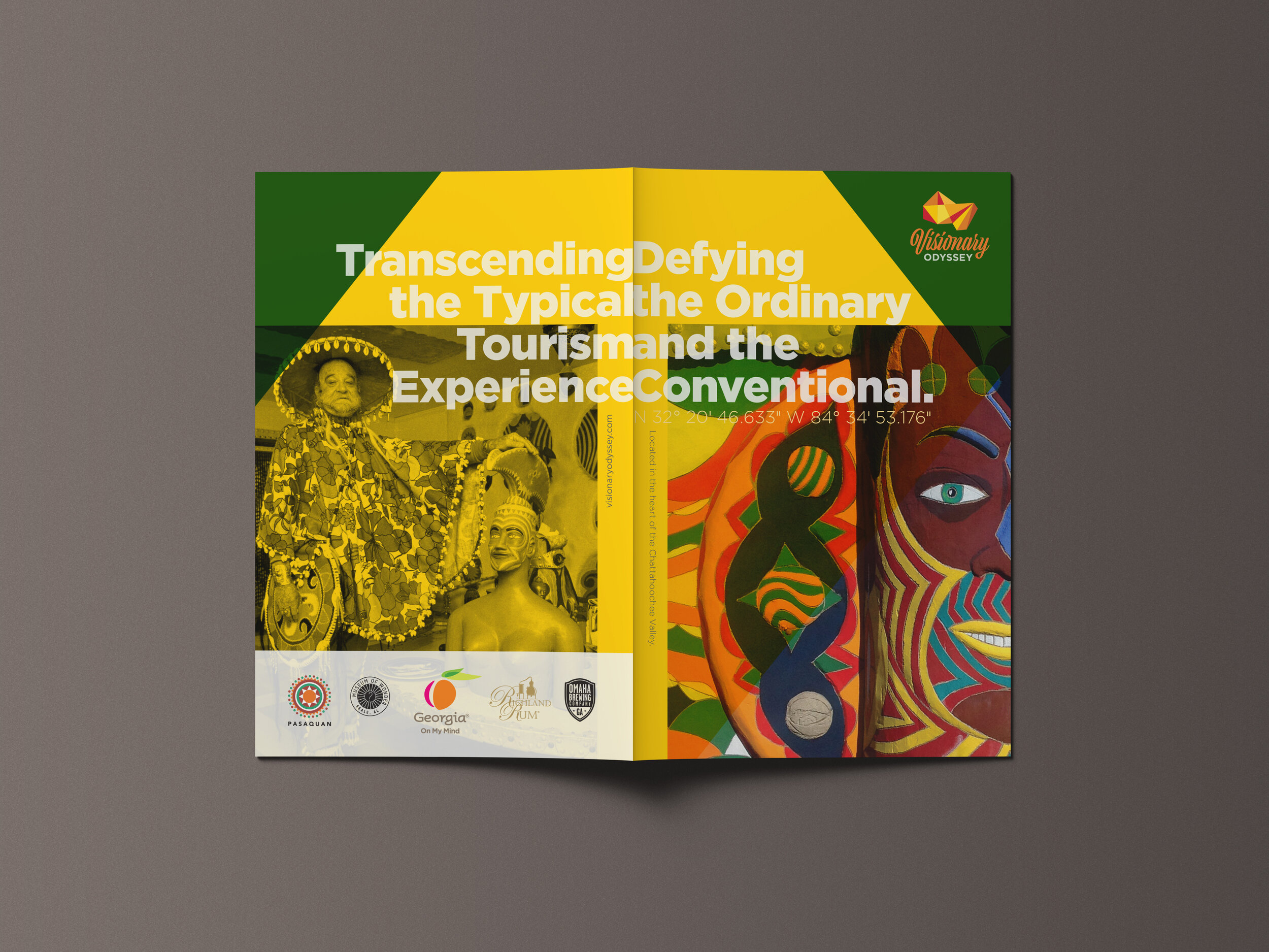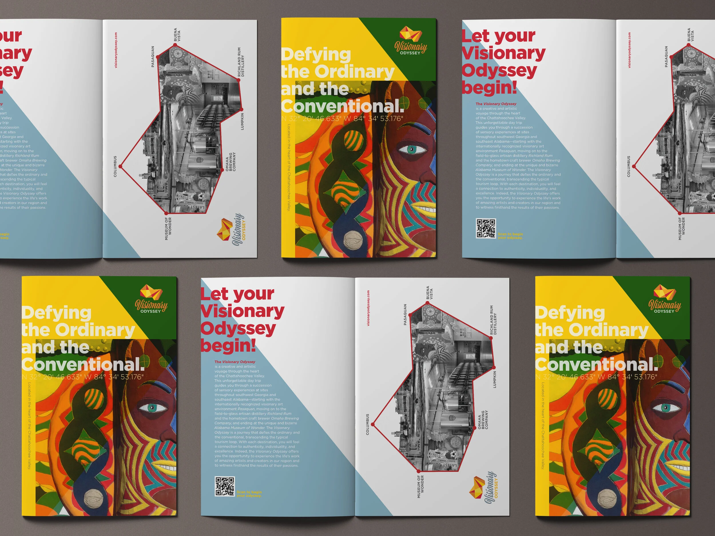 The logo was inspired by the physical locations of each organization and how they are interconnected. Although Pasaquan was consider the “central” location, travelers were encouraged to explore the region finding their way to each location. The various paths symbolized in the logo created a unique faceted mark, remarkably similar to a cut gem stone suggesting something precious is to be found on a journey along the Visionary Odyssey.